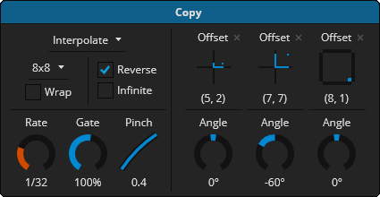 复制插件根据传入信号的位置生成新信号,用于创建基于原始位置(按键)的基本形状和运动。右侧有一个偏移列表,使用“+”按钮可以创建额外的偏移,作为相对位置来生成与移动插件类似的信号。要删除偏移,可点击偏移标题旁边的“X”按钮。偏移也可以通过右键点击偏移值来使用绝对位置。