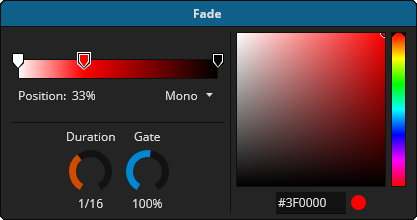 Duration和Gate旋钮控制渐变的生成时长。Duration可以用音乐细分表示,也可以通过右键点击旋钮切换为毫秒值。Gate作为Duration的简单乘数。