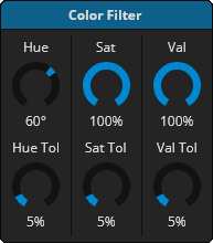 颜色滤波器插件用于只允许具有特定颜色的信号通过并传递给下一个插件。可通过色调、饱和度和明度旋钮定义匹配颜色,并通过各自的容差旋钮允许一定差异来检查匹配颜色。匹配颜色的传入信号将通过该插件,其他信号将被阻止。